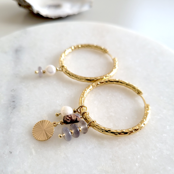 Goudkleurige creolen van RVS met hangers van edelsteen en zoetwaterparels.