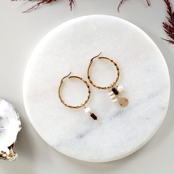 Goudkleurige creolen van RVS met hangers van edelsteen en zoetwaterparels.