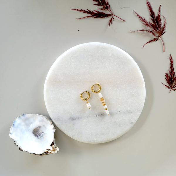 Goudkleurige creolen van RVS met hangers van edelsteen en zoetwaterparels.