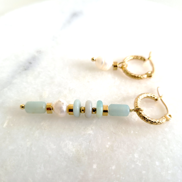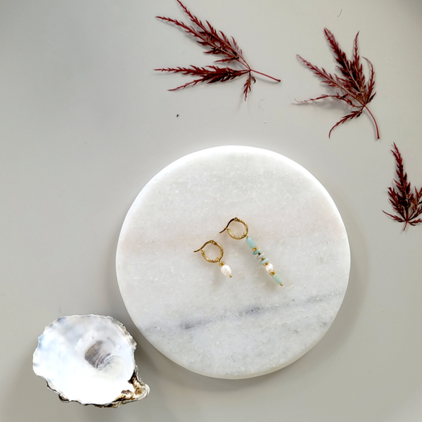 Goudkleurige creolen van RVS met hangers van edelsteen en zoetwaterparels.