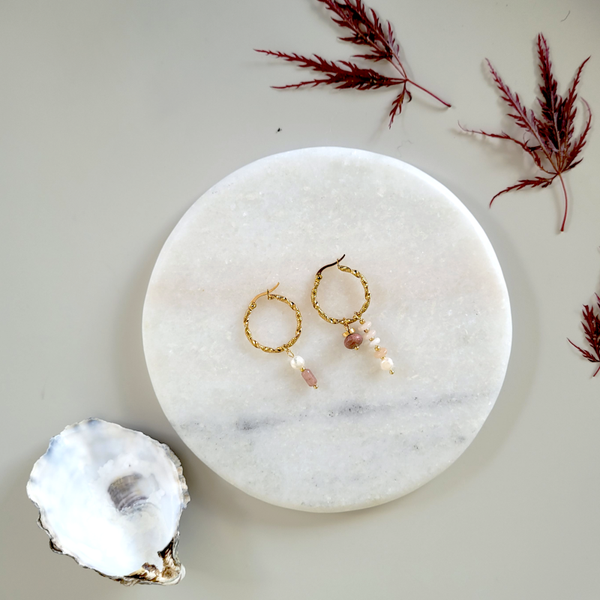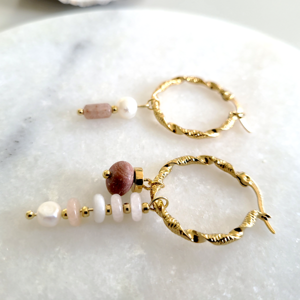 Goudkleurige creolen van RVS met hangers van edelsteen en zoetwaterparels.