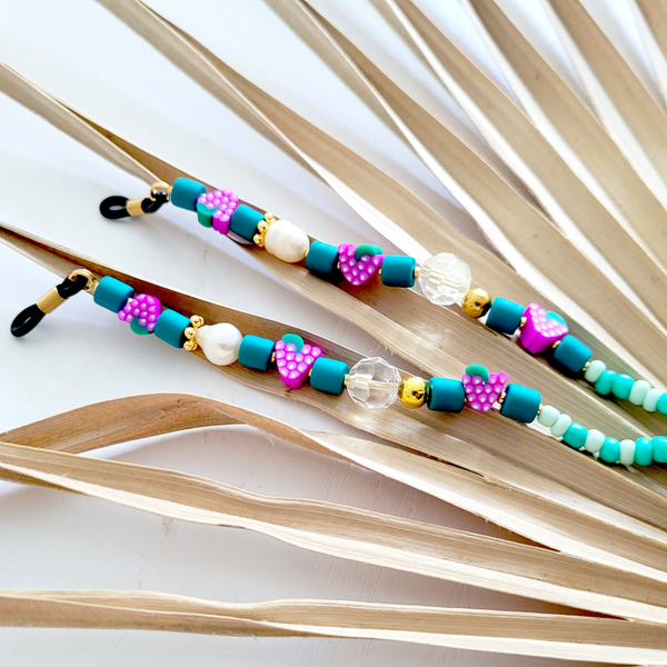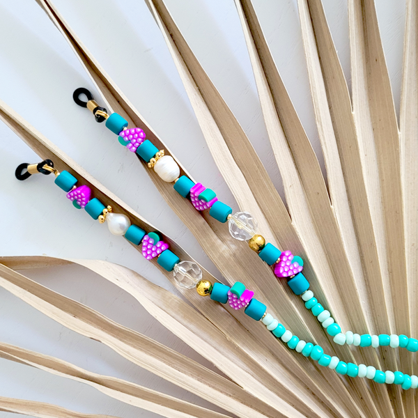 Zonnebrilkoord van polymeerkralen, glaskralen en zoetwaterparels met zwart brilkoordeindje.