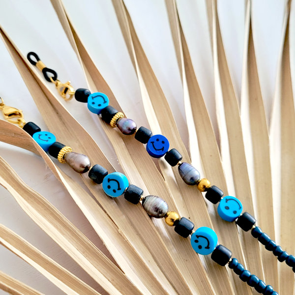 Zonnebrilkoord van polymeerkralen, glaskralen en zoetwaterparels met zwart brilkoordeindje.